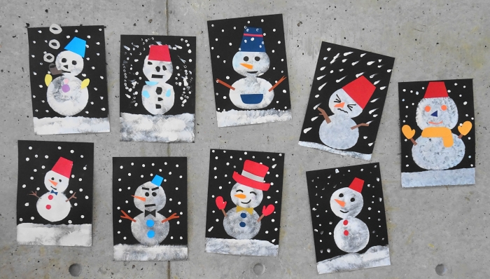 雪だるまの形にくりぬいた紙の上からタンポで絵の具をポンポンと叩いて色を重ねました